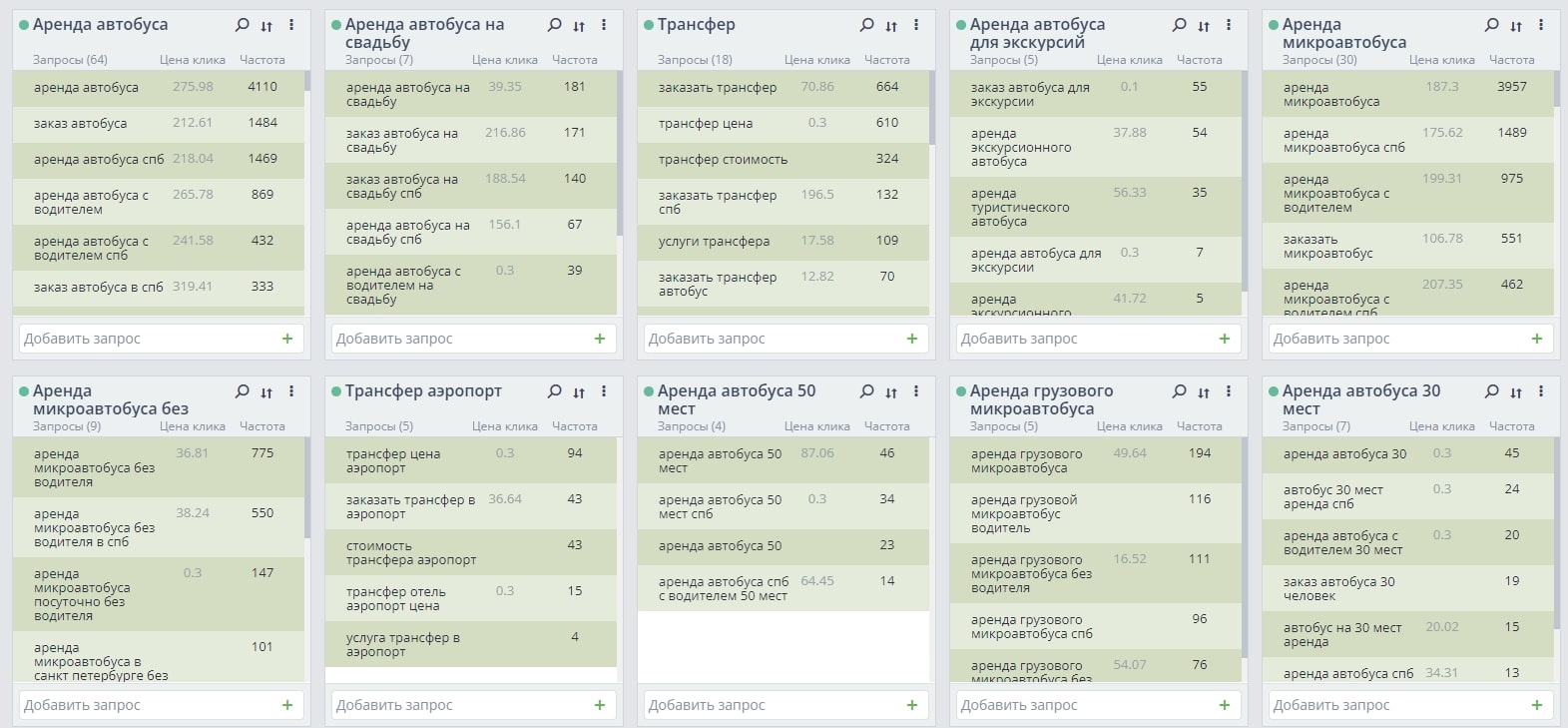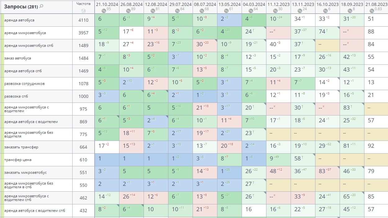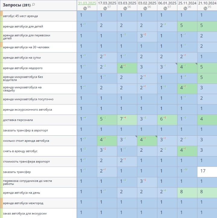 Сбор высокочастотных и среднечастотных запросов по теме аренды автобусов и микроавтобусов (аренда с водителем, на свадьбы, перевозка пассажиров, трансферы и т.д.), оптимизация страниц сайта под запросы для их выведения в топ-10 выдачи поисковых систем.
