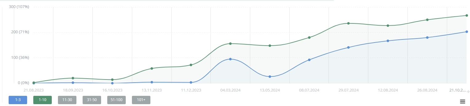 За все время работы нам удалось поднять позиции с 0% до 95% в топ-10, с 0% до 72% в топ-3.