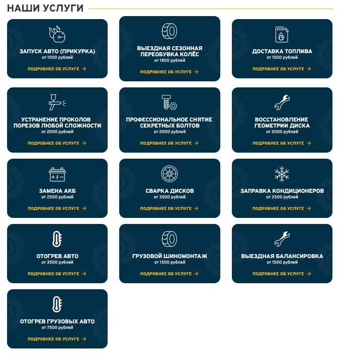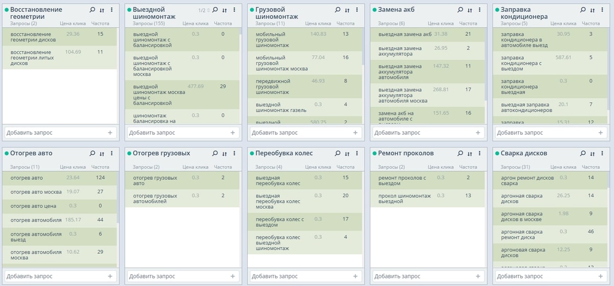 - Сбор запросов по темам: сварка трещин в литых дисках, запуск авто (прикурка), выездная сезонная смена шин, доставка топлива, устранение проколов порезов любой сложности, профессиональное снятие секретных болтов, восстановление геометрии диска, замена АКБ, сварка дисков, заправка кондиционеров, отогрев легковых авто, отогрев грузовых автомобилей, грузовой шиномонтаж. А так же были собраны запросы связанные с выездной заменой шин по районам Москвы.